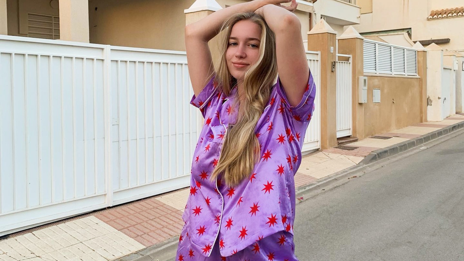 Nos ofrece una visión noble de esta tendencia de pijamas, a veces malinterpretada. Mejor aún, la vive. Fiel a su estilo minimalista y chic, luce un look engañosamente desenfadado, con las manos en los bolsillos. Un camisón rosa pastel con rayas negras en los extremos, realzado por unos refinados pantalones vaporosos y unas sandalias de gladiador con un pequeño tacón. Con este conjunto de diseño magistral, la actriz de rostro angelical no parece recién salida de la cama, sino de las páginas de una revista de alta costura.